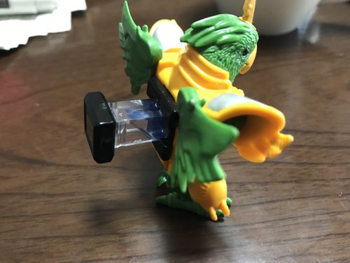 いかつい鎧をつけていますが、インコというのがいかにも平和的で、彼はもしかすると非常時に緊急に召集された本来は別の仕事をしている人なんじゃないかなと、そういう妄想をして遊んでいます。